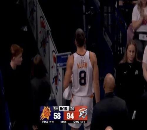 北京时间12月11日,NBA杯1/4决赛雷霆主场138-89狂胜太阳的比赛,在第三节比赛太阳首发主力阿伦发力推倒霍姆格伦引发场上冲突,被裁判吹罚一次二级恶意犯规直接驱逐离场。